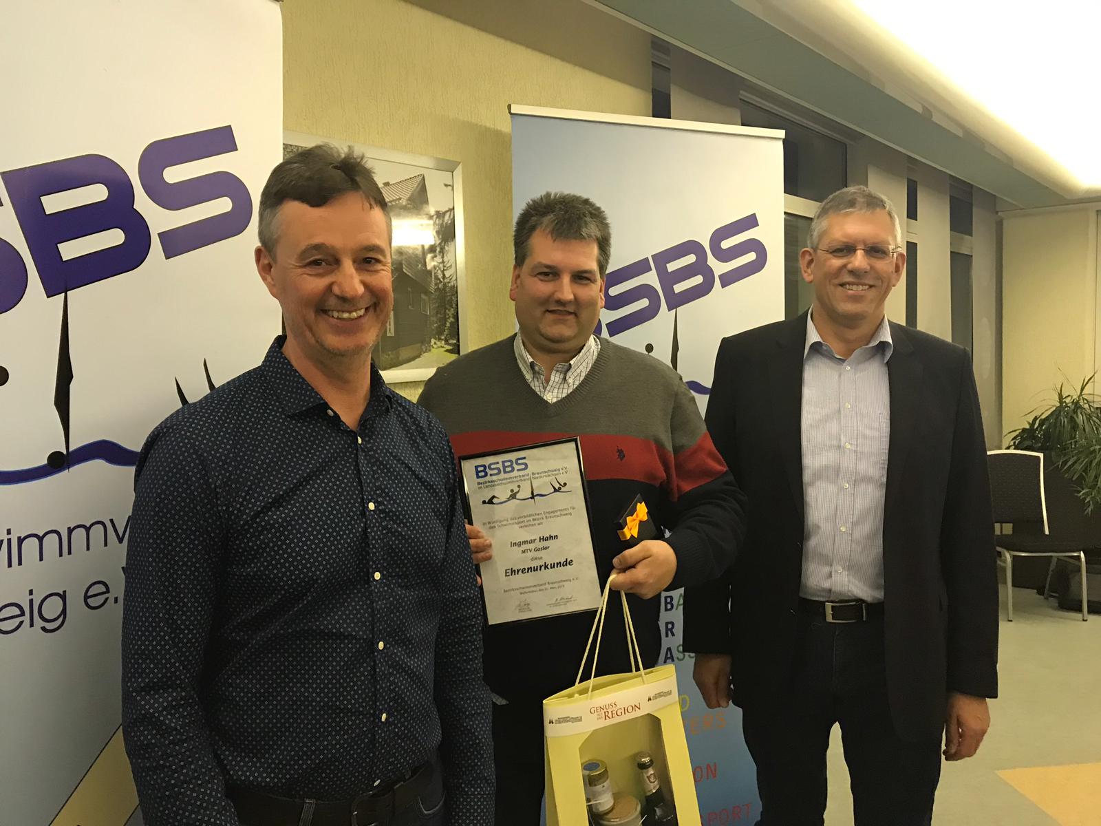 Während des Bezirkstages bedankte sich der Schwimmbezirk Braunschweig bei Ingmar Hahn für die verdienstvolle Arbeit mit einer Ehrenurkunde und einem Präsent. Ausgeschieden als Schwimmwart und aus dem Vorstand des BSBS bleibt Hahn dem Bezirk Braunschweig aber als Co-Administrator der Homepage und als Schiedsrichter Schwimmen erhalten. Dazu nimmt Hahn auch weiterhin Aufgaben innerhalb des IPC wahr.