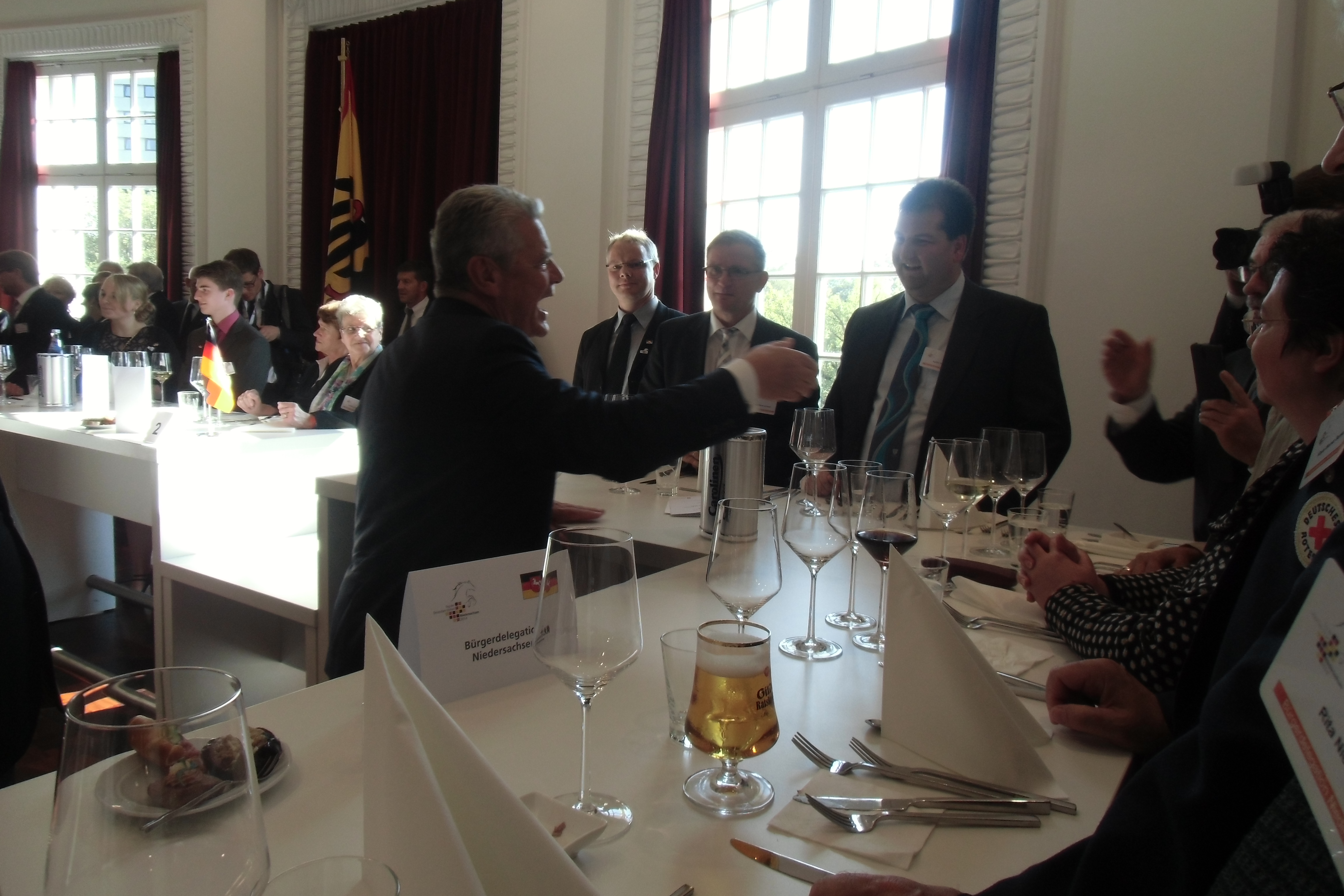 Im Anschluss an den Festakt, lud dann der Bundespräsident, Joachim Gauck, die Bürgerdelegation als Dank zu einem Empfang ein, wo sich Gauck dann auch Zeit nahm, mit den Personen der Bürgerdelegation persönliche Worte zu wechseln und sich über das Engagement zu informieren und dieses zu würdigen.