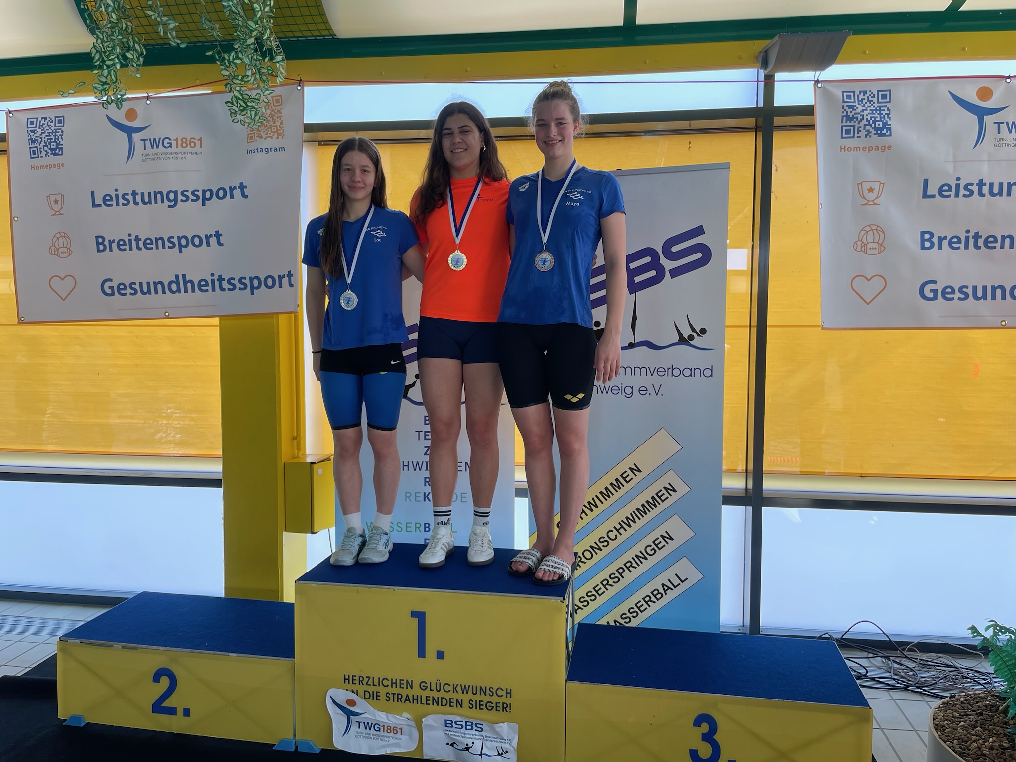 Der Landestitel bei den Vereinsstaffelschwimmern ging in 54:48,77 nach Braunschweig. Anton Peppel, Leni Kosak und Martha Jakobi nahmen die Goldmedaillen bei der Siegerehrung entgegen.