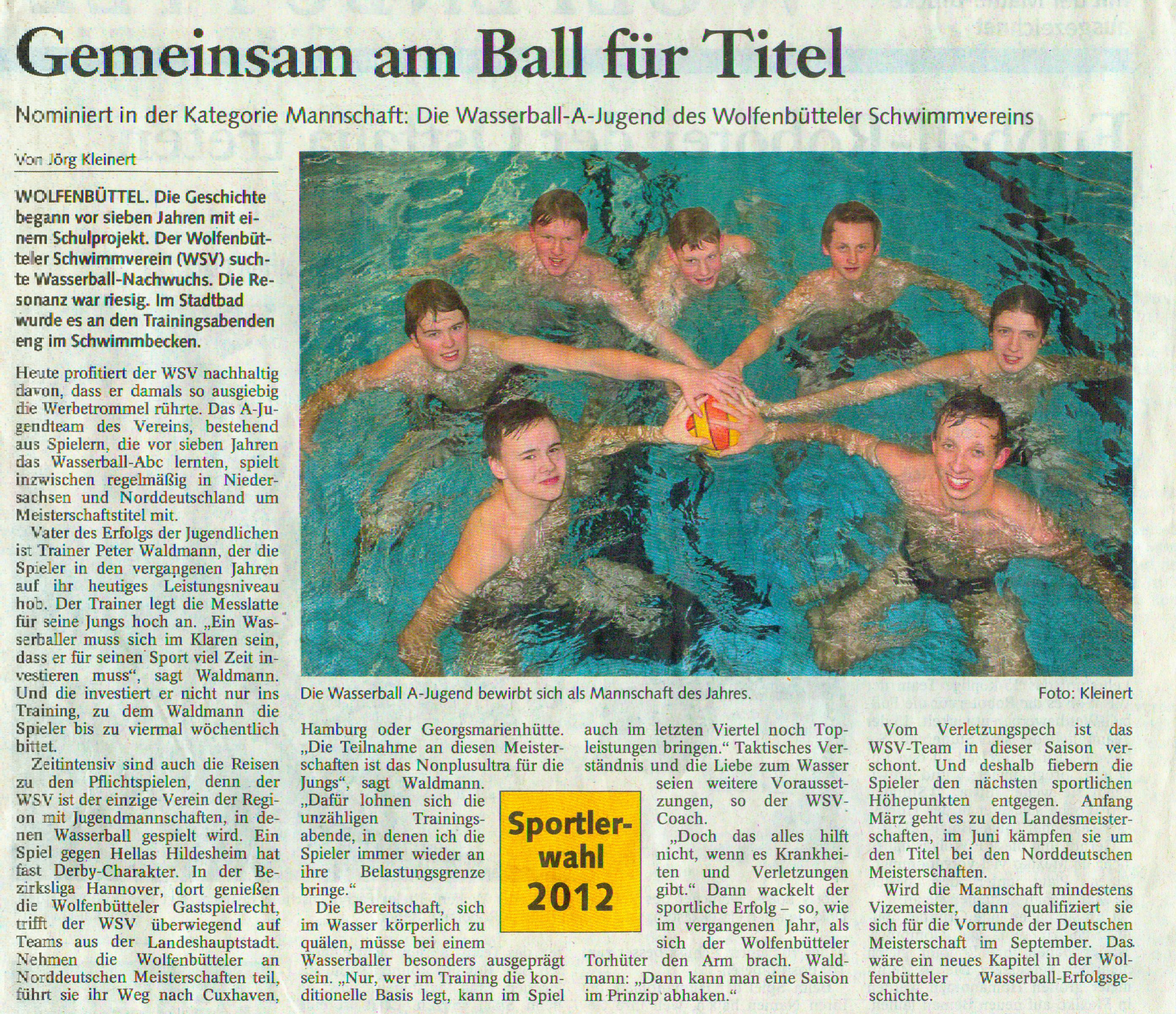Die Wasserball-A-Jugendmannschaft des Wolfenbütteler Schwimmvereins ist in der Kategorie Mannschaft für die Sportlerwahl 2012 nominiert. Näheres dazu siehe BZ vom 1.3.12