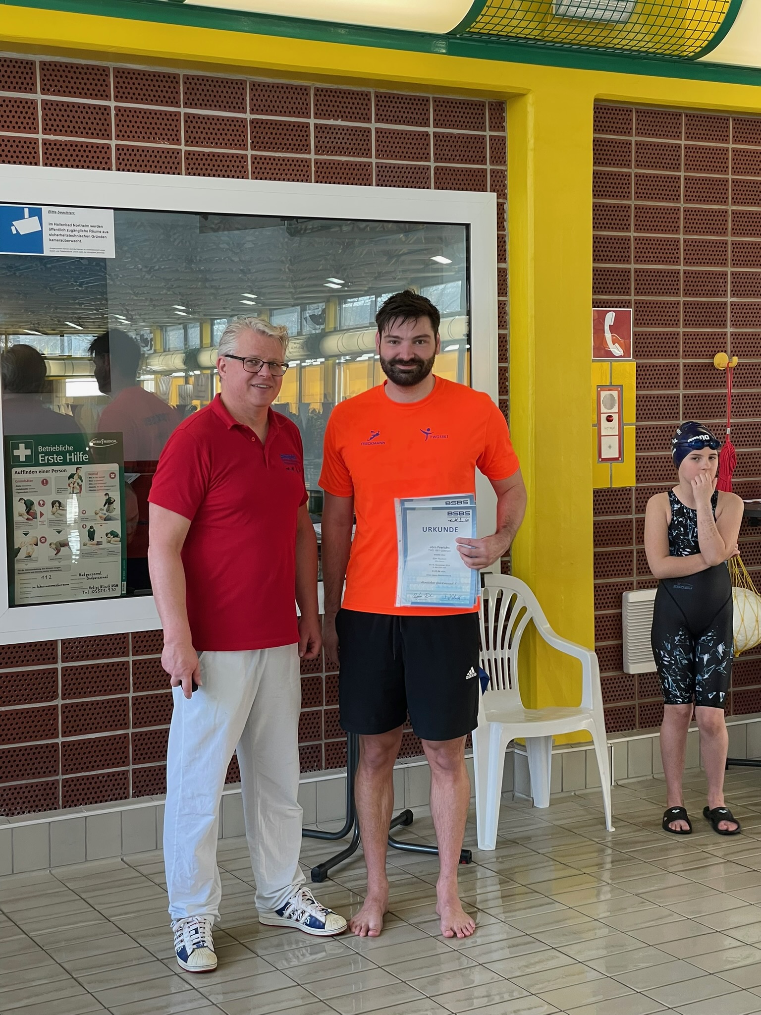 Dazu fanden auch noch Ehrungen für errungene Bezirksrekorde statt! Für alle Anwesenden schon fast zur Gewohnheit geworden, erhielt Jörn Frerichs vom 1. Vorsitzenden Stefan Schrank wieder 4 Urkunden für zum Jahresende 2024 geschwommene Bezirksrekorde mit dazugehörigen Geldpräsenten überreicht! In diesem Rahmen kam auch die Ehrung von Nick Näther hinzu, der Ende November in Salzgitter zwei Rekorde erschwamm.