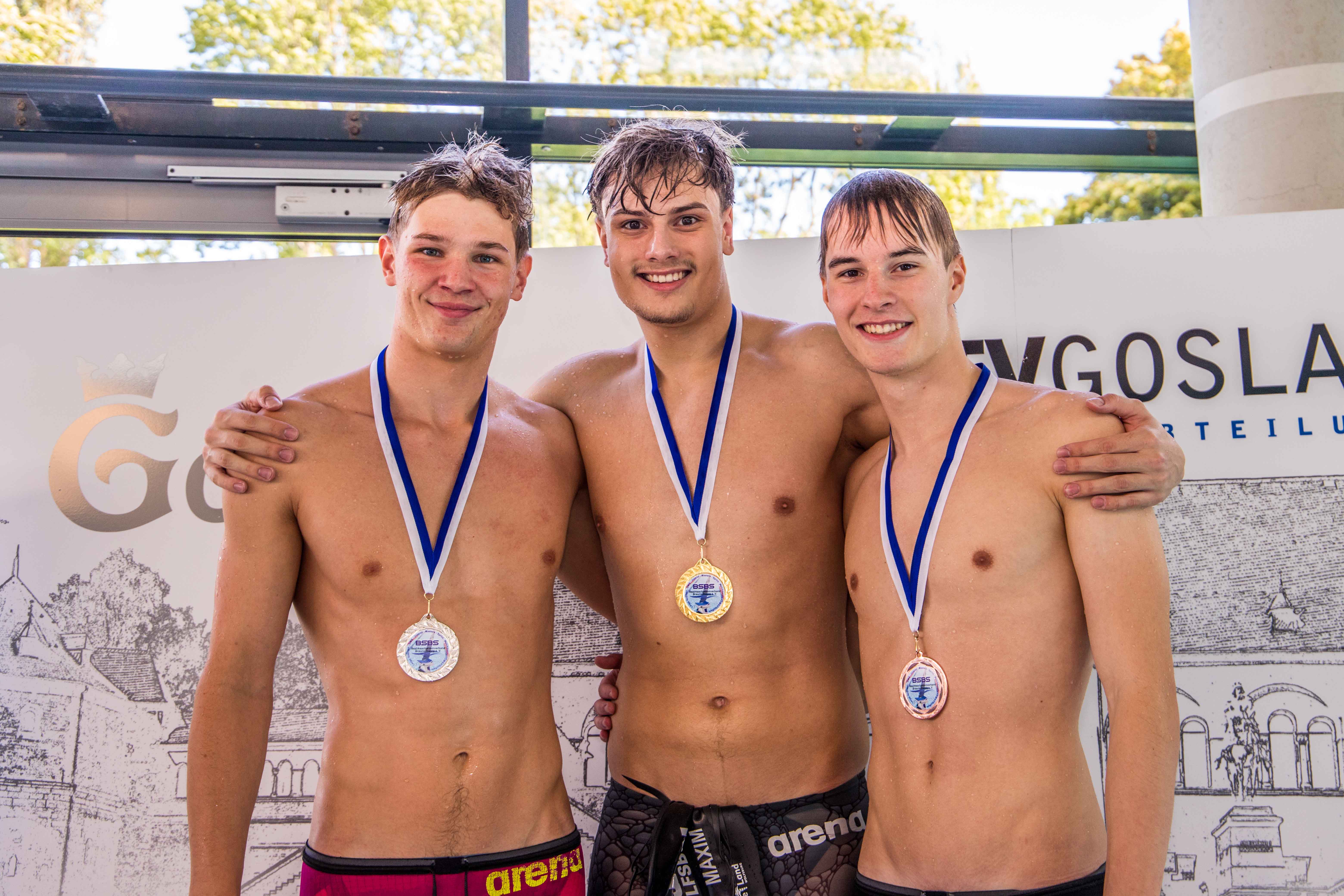 Bei den Herren wurde gleich das erste Finale, die 50m Schmetterling zu einem Krimi. Maxim Schlaht vom TV Jahn Wolfsburg entschied den spannenden Zieleinlauf in 0:27,33 min. mit ganzen 2/100 sec. vor Leon Christopher Taube von der TWG Göttingen, weitere 6/100 mehr benötigte Louis Gerlach von der SSG Braunschweig als Dritter, mit gerade einmal 3/100 mehr kam Kevin Sommer (ebenfalls SSG Braunschweig) knapp geschlagen auf Platz vier ein. Heißt… vier Schwimmer wurden innerhalb von „elf hundertstel“ Sekunden gestoppt, Elektronik sei Dank! Über die 50m Brust setzte sich Bezirksrekordler Nick Näther von der TuS Clausthal-Zellerfeld in 0:29,65 Minuten mit gut eineinhalb Sekunden vor Niklas Mattis Gries von der TWG Göttingen durch, ganze 7/100 dahinter Moritz Kröner (ebenfalls TWG Göttingen). Seinen zweiten Titel sicherte sich Schlaht über die 100m Lagen. Mit 0:59,79 min. blieb allein er unter der Minutengrenze, 1 ½ Sekunden mehr benötigte Moritz Susmann vom ASC Göttingen, eine weitere Sekunde dahinter Vereinskamerad Nikita Bloch. Über 50m Rücken sicherte sich dann auch Leon Christopher Taube für die TWG Göttingen einen Titel bei den Herren. Nach 0:27,61 Minuten schlug er 23/100 sec. vor Susmann, dritter wurde auch hier Bloch mit weiteren 8/10 Sec. mehr. Maxim Schlaht ließ mit 0:24,44 Minuten noch seinen dritten Titel folgen. Mit Silber erreichte Kevin Sommer mit 0:25,01 min. dann auch seine offene Medaille, Moritz Susmann schwamm nach zweimal Silber nun zu Bronze. Es fehlten 8/100 zu einer weiteren Silbermedaille.